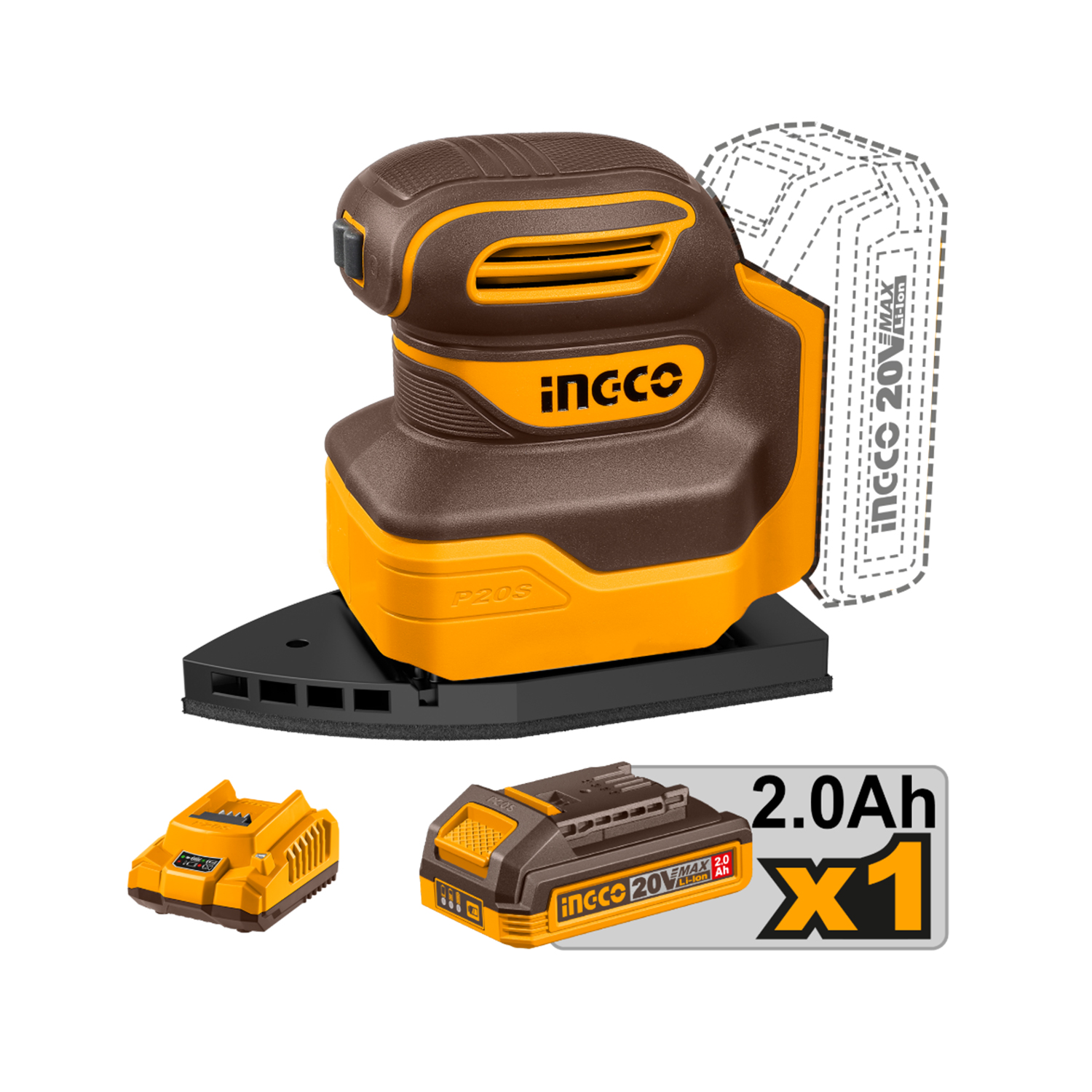 Lijadora orbital delta Ingco CPSLI20141 20V (1x2.0Ah) c/acc.
