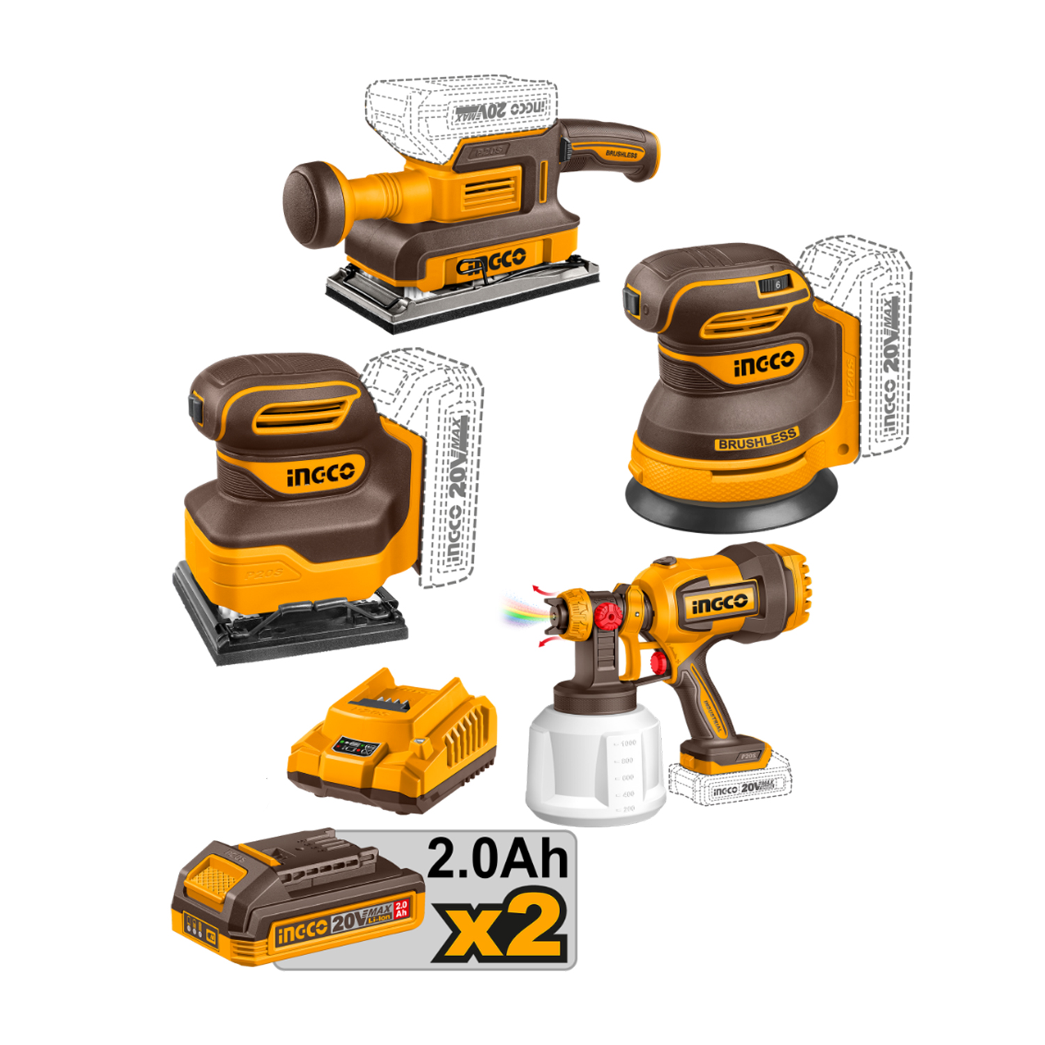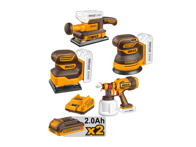 Combo Ingco Brushless 3 Lijadoras+Pistola Pintar+2x4.0Ah