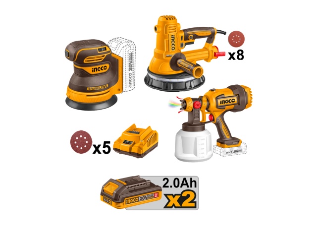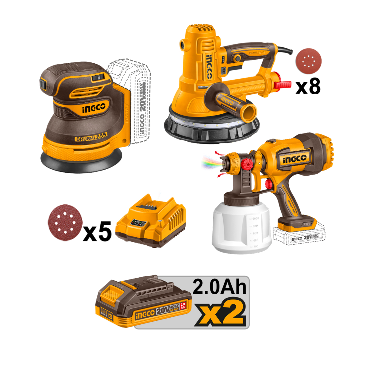Kit Ingco 20V Lijadora Yeso+Lijadora rot+Pistola Pintar+2bat