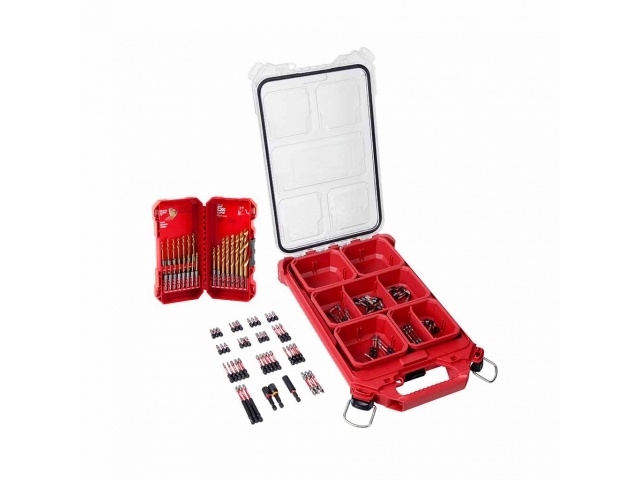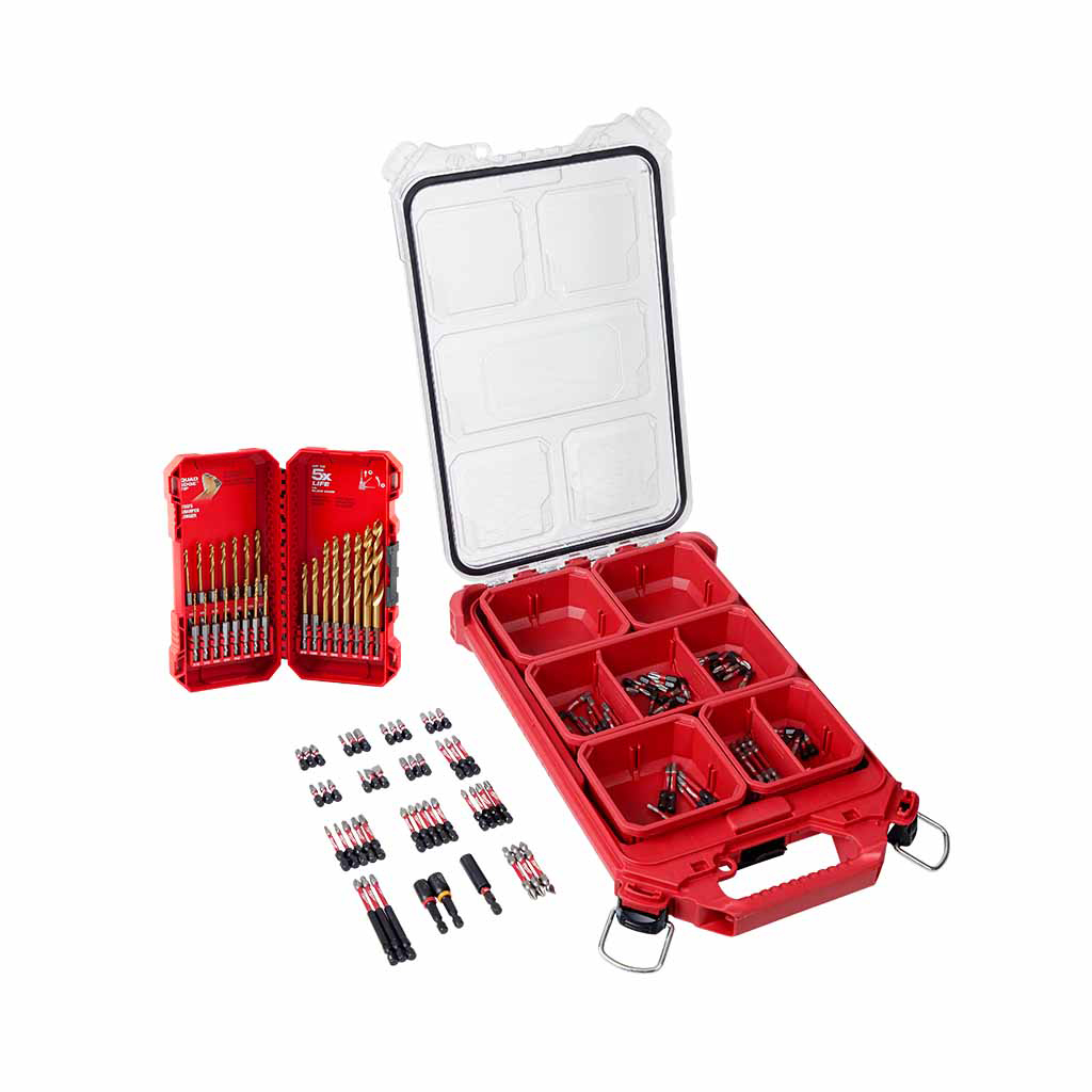- Cada broca cuenta con Shockzone™ optimizado para el tipo y la longitud de la punta para absorber el torque máximo y evitar roturas. Puede mantener organizadas las 100 puntas de destornillador de impacto SHOCKWAVE™ en el organizador compacto de perfil bajo PACKOUT™ incluido, equipado con una parte superior transparente para una fácil identificación de las piezas de un vistazo.