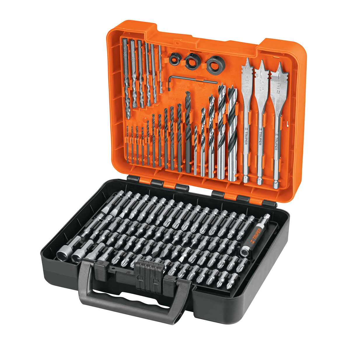 • 3 brocas de manita con punta guía para perforaciones precisas y zanco hexagonal de cambio rápido